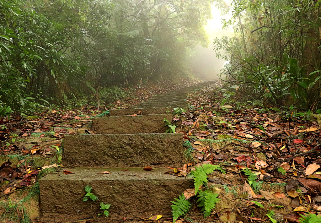 隨著車子爬升的坡度越高,霧氣越來越濃。看著繚繞著山頭的雲霧,不禁期待走在古道上聽雨落。古道前有一座小小的伯公廟,沿著蜿蜒的古道往下走,可以欣賞蕨類生態。蜘蛛網在水滴掛飾下,閃亮著。
